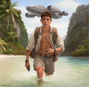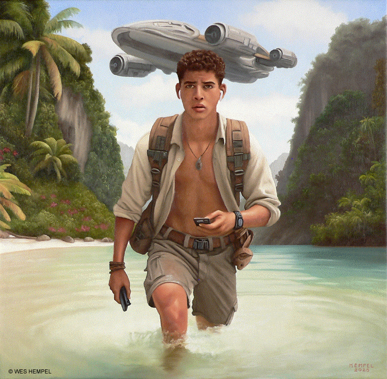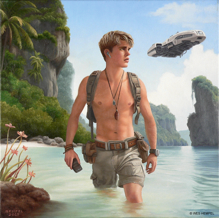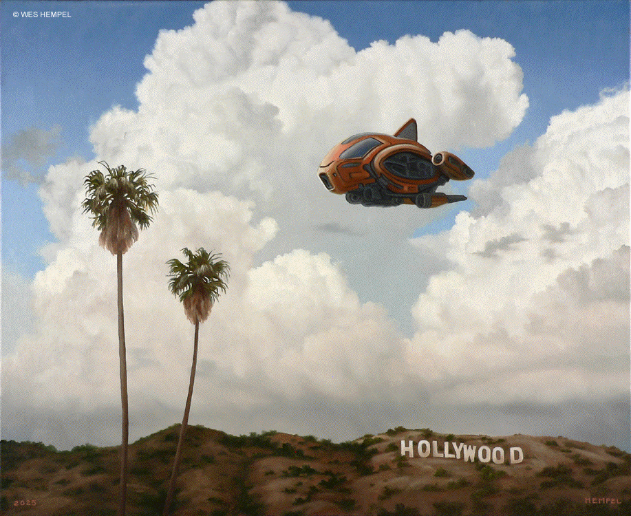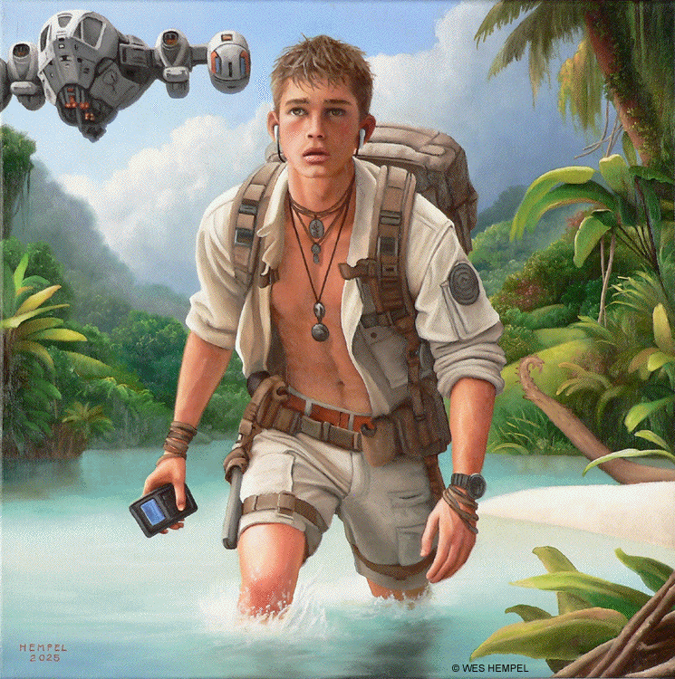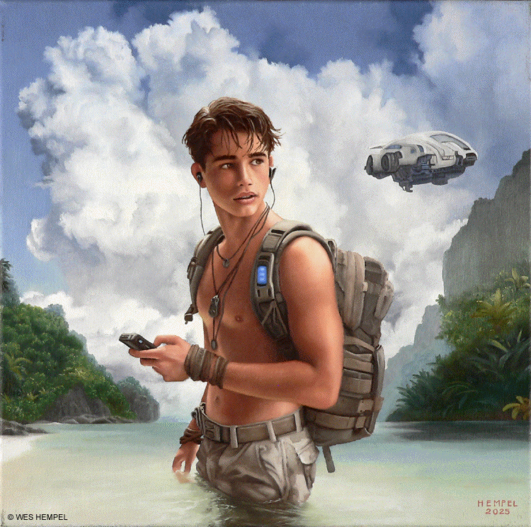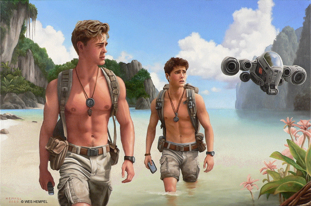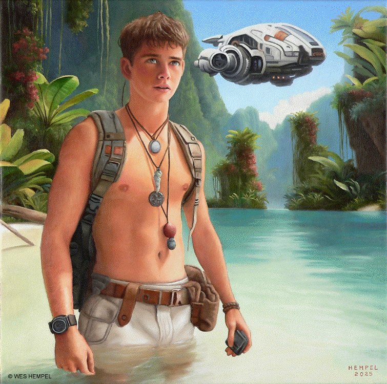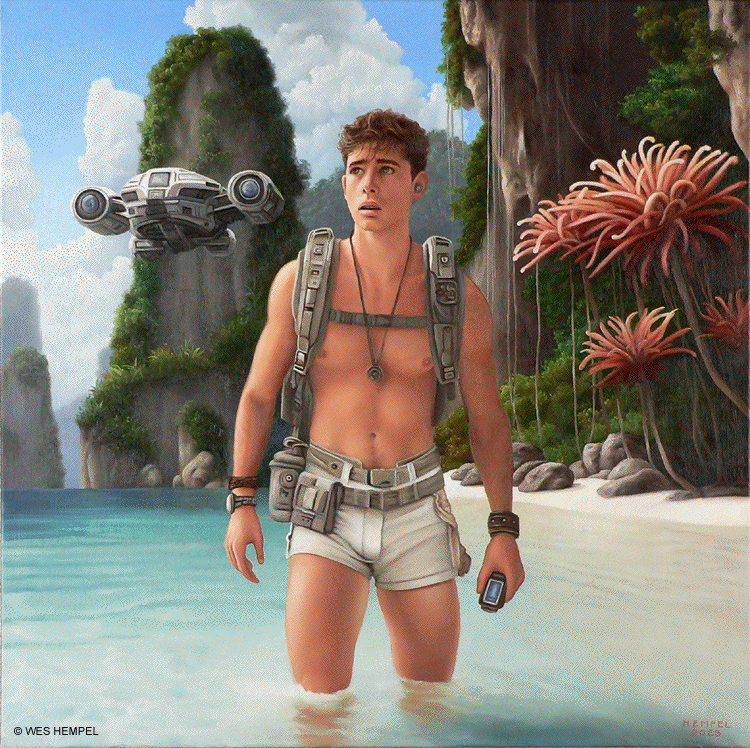 These paintings of imaginary film stills are based on a screenplay for a Science Fiction film, titled Regression, that an uncle of mine developed in the 1950s. The film was never made, nor, to my knowledge, has any of the script survived, but from memory I've tried to recreate what actual scenes may have looked like had the film been made. From what I remember of my uncle's stories, the script was about a crew of astronauts who travel to a tropical exoplanet that has an earth-like atmosphere. They begin exploring the surface in pairs but almost immediately get separated and lose contact with each other and with the ship. Isolated, they begin to reverse in age. It takes some time for them to notice, but they're growing younger at alarming rates. They wade in the shallows of coves, discovering that something in the water slows the regression process. Their ship sometimes reappears in the sky, but oddly in differing forms, as if something's trying to replicate it but can't get it right. Later it's revealed that the planet itself is a sentient life form that is purposefully regressing them. It senses dishonesty and aggression in them (elements fleshed out in earlier subplots) and can only communicate with minds that are free of guile. By returning them to their more innocent boyhoods, it hopes to establish contact. Wes Hempel ______________